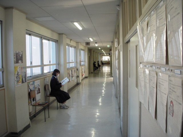 1月8日、午後は3年生の面接練習がありました。三中の全先生方が面接官となり、全校体制での面接練習です。写真は次の順番を廊下で待っている姿です。緊張した面持ちで熱心に面接ガイドに目を通していました。この緊張感が、本番の面接で必ず生きてきます。夢に向かって頑張れ三中生!