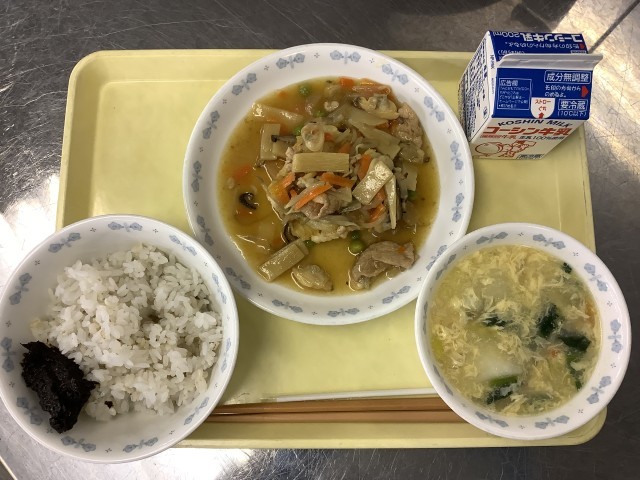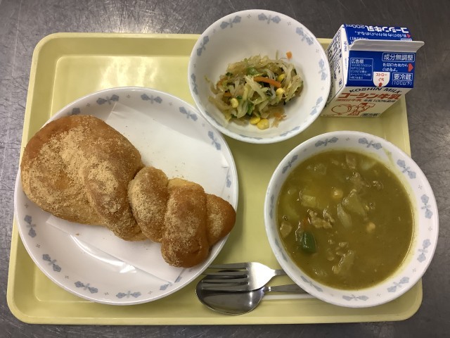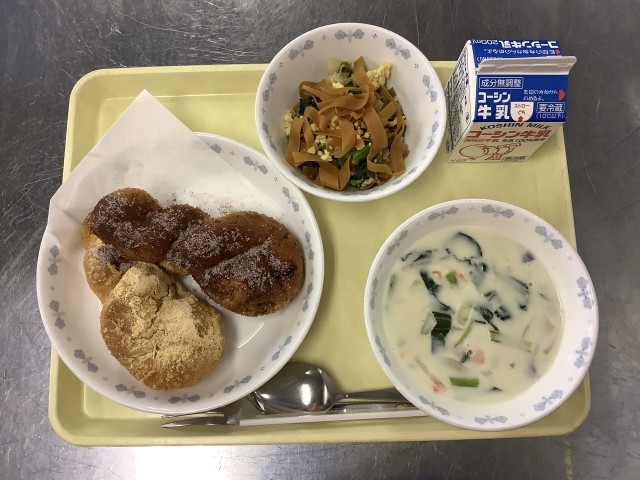 学校給食週間3日目です。今日は「給食の歴史」がテーマの献立です。「揚げパン」は、給食が栄養源として重要視されていた戦後まもない頃、給食がコッペパンと脱脂粉乳しかない時代にできました。この頃は、学校を休んだ子どもに給食のパンを届けることがあったそうです。時間が経つとパンが硬くなってしまうため、どうすればおいしく食べられるのか調理師さんが考え、揚げパンが誕生しました。それが生徒の間で人気となり、普通の献立でも登場するようになったと言われています。
