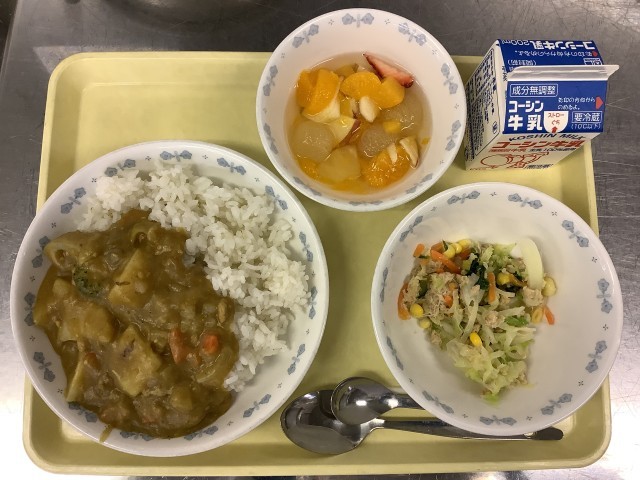 今日は、給食委員コラボ祭(フェスタ)第二弾です!「クリスマス」をテーマに2年生の給食委員がメニューを考案しました。「クリスマスチキンカレー」は、クリスマスの定番であるチキンと給食の大人気メニューであるカレーを組み合わせました。ブロッコリーと星型の人参でツリーをイメージしています。
