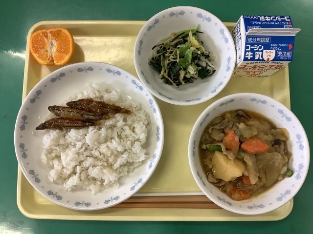 学校給食週間最終日です。今日は「昔の給食」がテーマの献立です。今日は、「鯨(くじら)」を使った給食です。昭和20年~40年代の食糧難だったころ、豚肉や鶏肉がたくさん出回っていなかったため、くじら肉は栄養価の高い安価な食材として庶民の食生活を支え、昭和45年前後(1970年代)まで学校給食でも子どもたちの健康を育む重要なメニューとして提供されていました。鯨の捕鯨(ほげい)は、昭和45年から乱獲(らんかく)などが原因で欧米を中心に反捕鯨運動が起こり、昭和62年には商業捕鯨が一時停止されました。現在、日本は商業捕鯨を再開しましたが、鯨は高級食材として食卓から遠ざかっています。今日は、調査用に捕鯨したくじらを給食用に特別に分けてもらい、竜田揚げにしました。貴重な食材です。味わって食べましょう。