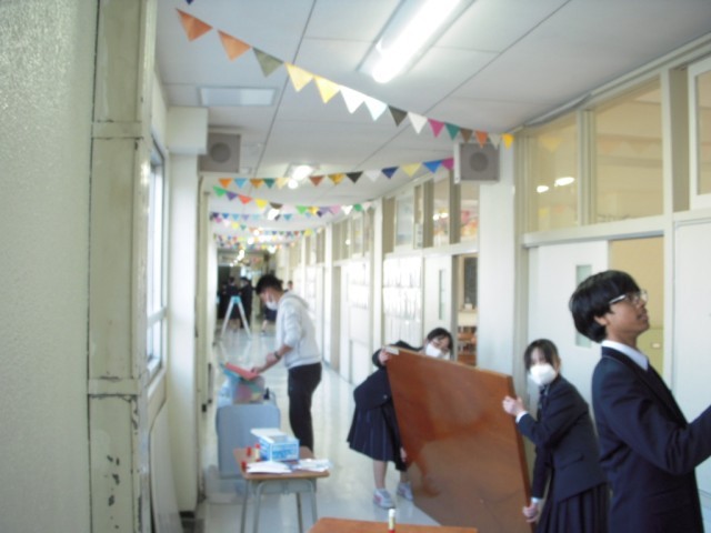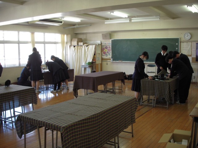 3月5日(木)明日からの学芸発表会に向けて展示の準備が始まりました。写真は準備が始まったころの状況です。それぞれの生徒が担当場所で生き生きと活動していました。夕方にはすべて完成し、あとは鑑賞日を待つだけです。完成した姿はぜひ当日ご覧ください。(4枚目)