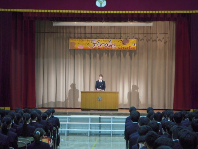 学芸発表会(生徒鑑賞日)の様子です。プログラム最初は国語科弁論でした。熱のこもった話し方で訴えが心に響く内容でした。