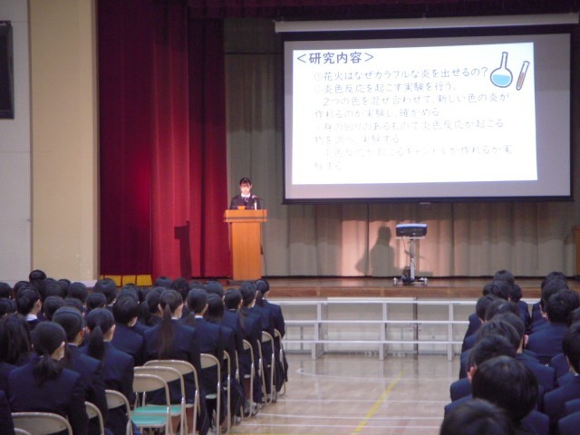 学芸発表会(生徒鑑賞日)の様子です。理科自由研究では、仮説をたてて実証する方法に関心させられました。研究の過程がしっかりと伝わる発表でした。