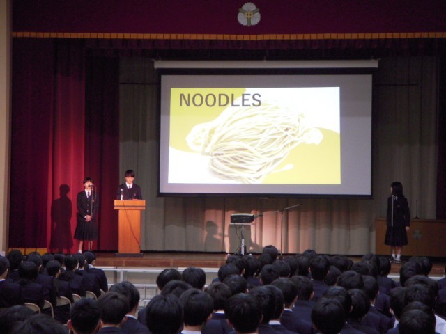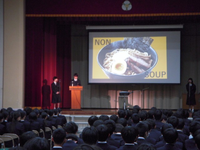 学芸発表会(生徒鑑賞日)の様子です。プログラム最初は英語科でした。英語での司会から始まり、堂々と発表する姿は、ふだんの授業の様子がよく伝わってきました。