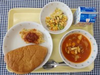 10月2日は「豆腐の日」にちなみ、熊本県の郷土料理の「びりんめし」を作りました。豆腐や野菜を炒め、ご飯と合わせる混ぜご飯ですが、絞り豆腐を炒める時に「びりん、びりん」と音が聞こえることが名前の由来です。給食室でも豆腐を絞り豆腐をしっかり炒め合わせて作ってもらいました。