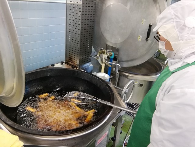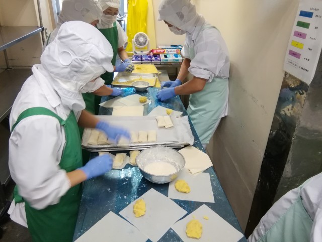 今日はおかずとしての春巻きではなく、スイーツな春巻きを作りました。中にはさつまいもとりんごが入っています。蒸したさつまいもとりんごを合わせた具を、調理員さんに一つ一つ丁寧に巻いてもらいました。