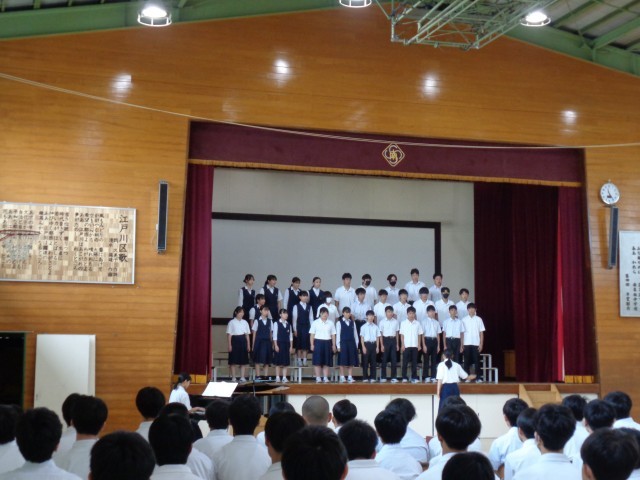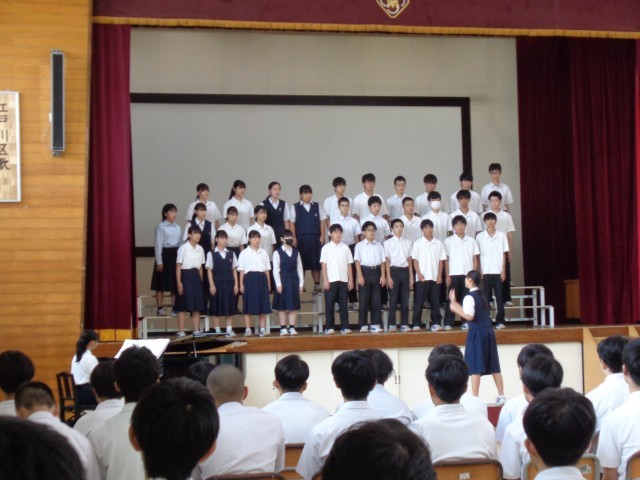 学年合唱練習の2回目で、今日は入退場および各クラスの「自由曲」を披露しました。