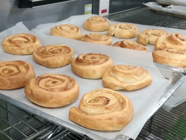今日は月に一度の手作りパンの日です。今回はシナモンロールです。朝から捏ねた生地にシナモンをのせて巻き、焼き上げました。寒くなってきましたが、発酵も無事にできてふっくらと出来上がりました。