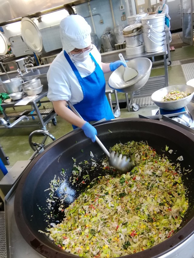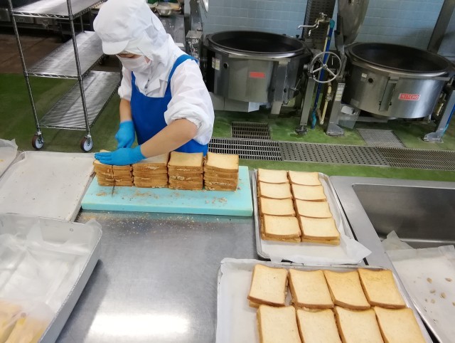 今日は「パンプキンクリームサンド」と「ツナマヨサンド」の2色パンです。調理員さんにそれぞれの具を食パンでサンドし、焼いた後にカットをしていただきました。どちらのトーストもとても人気でした。