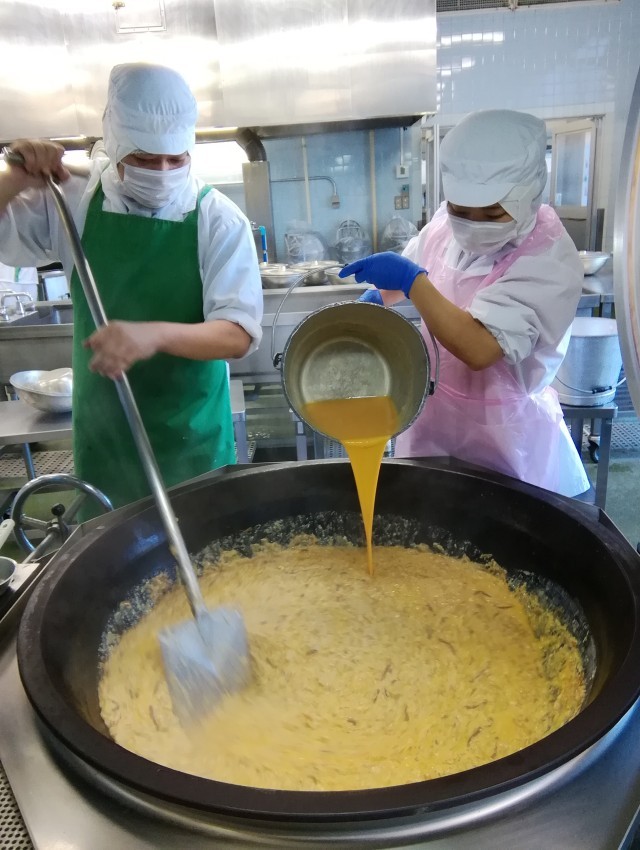 11月の給食は親子丼からスタートです。今日の親子丼では35kgの卵を使って作りました。中には高野豆腐も入っていて、ふわふわで出汁を吸って美味しい仕上がりになりました。