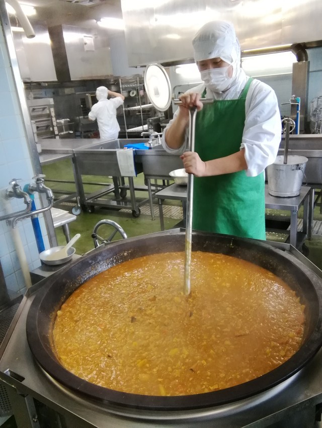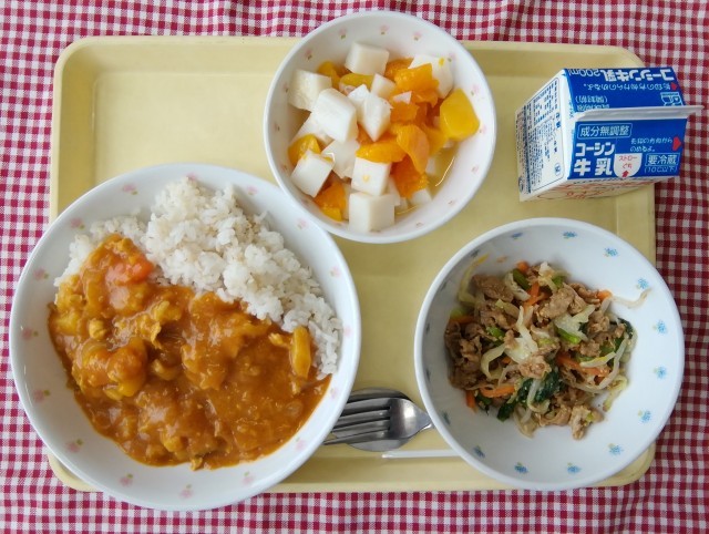今日は午前中にロードレース大会がありました。そのため、疲れて帰ってきてからも食べやすく、配膳しやすい献立にしました。チキンカレーには秋が旬の根菜をたっぷり使い、栄養満点です。