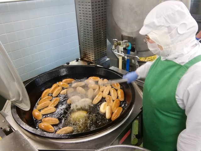 今日はリクエスト給食アンケートの主食・副菜部門でもっとも人気のあった「揚げパン」と「焼肉サラダ」です。揚げパンはきな粉とココアの二種類の味でしたが、どちらもとても人気でした。サラダは、豚肉を甘辛い味に炒めてトッピングしています。普段野菜が苦手な人も食べてくれているようで、いつもよりも残しが少なく、人気な様子でした。
