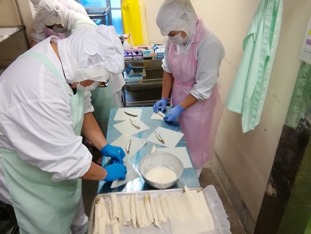「ししゃものパリパリ揚げ」は、軽く下味をつけたししゃもを春巻きの皮で巻き、油で揚げて作っています。パリっと食感良く揚げてもらったので、ししゃもが苦手な人も美味しく食べられたのではないかと思います。給食で出るししゃもは、貴重なカルシウム源でもあるので、ぜひ食べてもらいたいと思います。