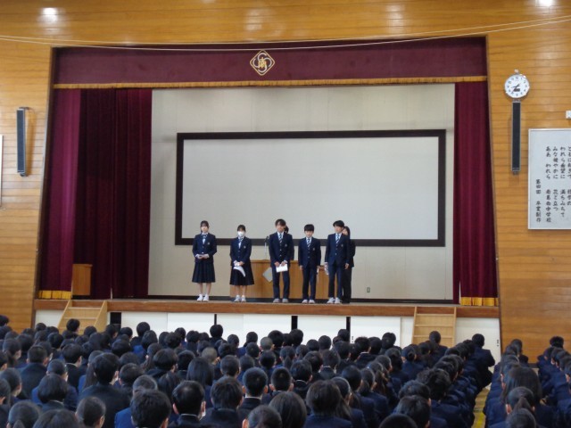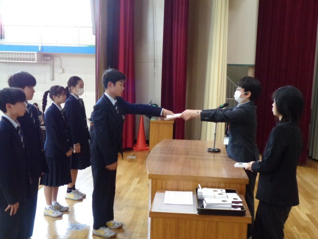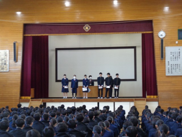 税の作文、標語、ロードレース大会(各学年第3位まで)の該当生徒が登壇しました。