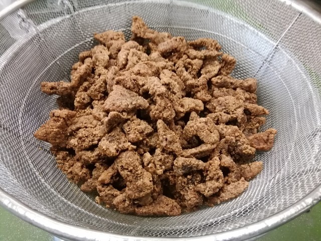 今日はくじら肉を使った竜田揚げです。昔の給食や家庭の食事において、貴重なたんぱく源となっていたのがくじらです。今回は数種類の野菜と調味料でしっかり漬け込んでもらい、食感も柔らかく、美味しい揚げ上がりになりました。