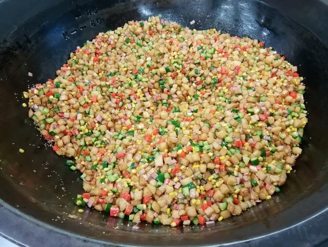 副菜の中華風ポテトサラダは、角切りにしたにんじんときゅうり、コーン、ハム、揚げたじゃがいもを合わせています。彩りがとてもきれいに出来上がりました。