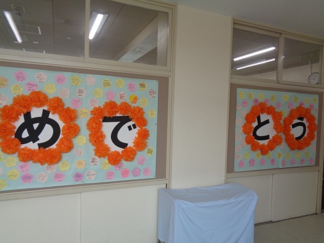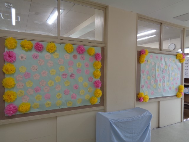 1年生のフロアには、先輩たちからの温かいお祝いメッセージが掲示されています。