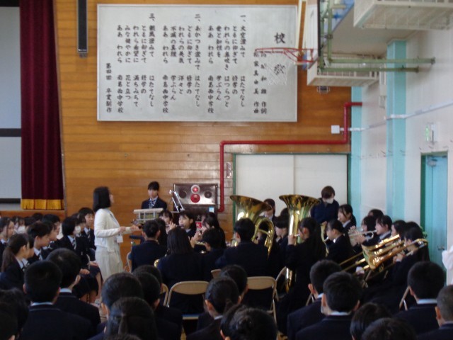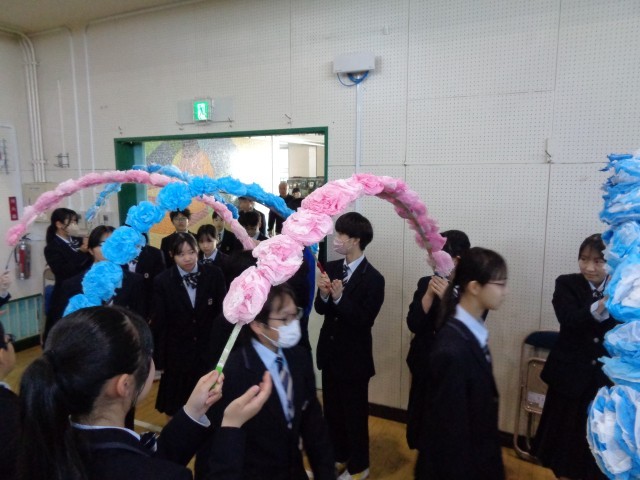 花のアーチをくぐって1年生は入場し、ウィンドオーケストラ部の歓迎の演奏を聞きました。