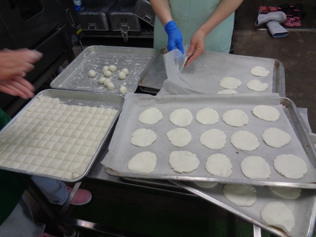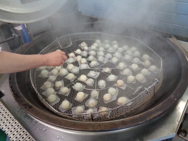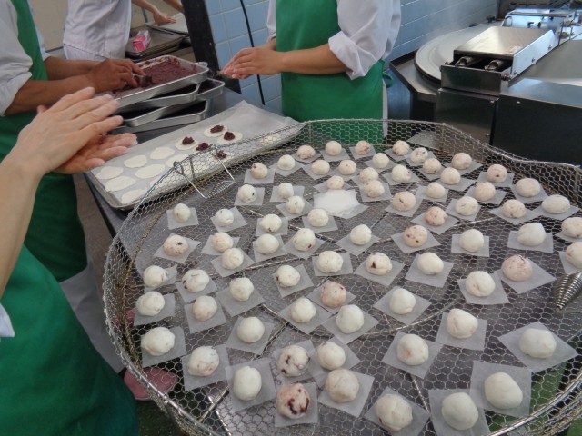 桜まんじゅうは、給食室の手作りで、あんこに桜の花を刻んで混ぜ、まんじゅうの生地で1個ずつ包み、蒸して仕上げました。生徒もよく食べていました。春を感じられる給食でした。