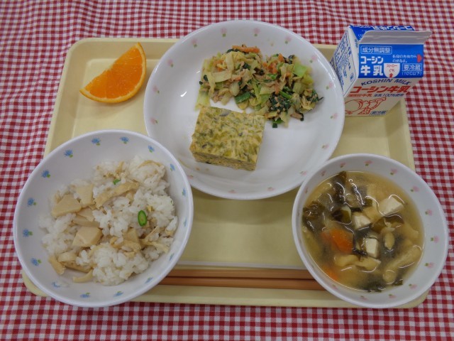今日のたけのこご飯のたけのこは、生のたけのこを使用して調理しました。生のたけのこならではの、歯ごたえや、風味を味わいました。生徒もよく食べていました。