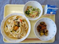 冬至の行事食です。冬至にかぼちゃを食べると、その冬は風邪をひかないと言われています。そこで、主食は、かぼちゃの入った『ほうとう』にしました。