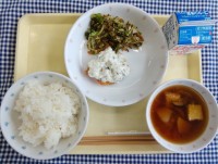 ライスコロッケは別名アランチーニといわれるイタリア料理です。今日はカレー風味のケチャップライスを丸めて揚げた後、ソースがまんべんなくかかるよう丁寧に仕上げていただきました。見た目以上にボリュームがありましたが、生徒たちはいつもと違うご飯の様子に驚きながらおいしそうに食べてくれていました。