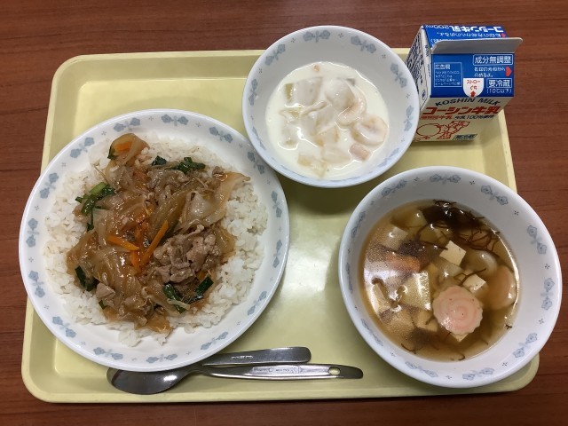 牛乳 プルコギ丼 もずくとなるとのスープ フルーツヨーグルト