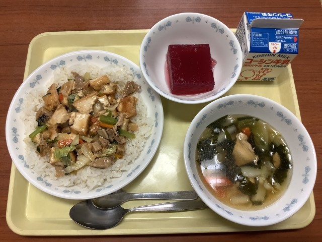 牛乳 家常豆腐丼 白菜とわかめのスープ グレープゼリー