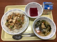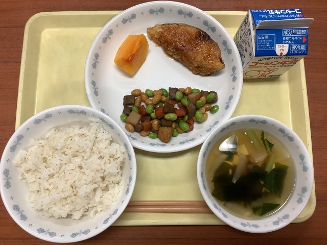 牛乳 麦ごはん かつおの甘酢がらめ 五目豆 野菜のすまし汁 柿