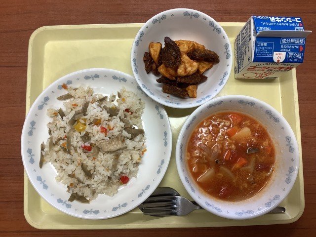 牛乳 ごぼうのピラフ レバーとポテトの変わりソース ABCトマトスープ