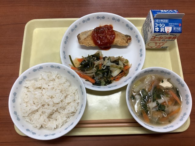 牛乳 麦ごはん 鰹のチリソースかけ 海藻サラダ 小松菜と厚揚げのスープ