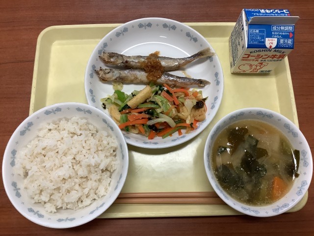牛乳 麦ごはん ししゃものピリ辛ソース のり酢和え すりごまの味噌汁