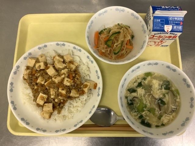 牛乳 マーボー丼 春雨サラダ 卵スープ
