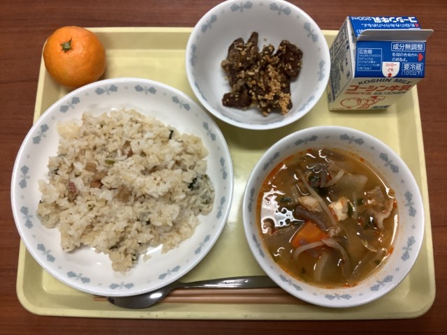 牛乳 れんこんチャーハン レバーのアーモンドがらめ 豆腐のチゲ汁 みかん