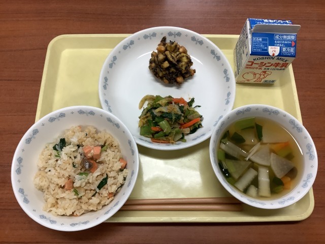 牛乳 鮭ご飯 岩石揚げ 白菜のお浸し いものこ汁