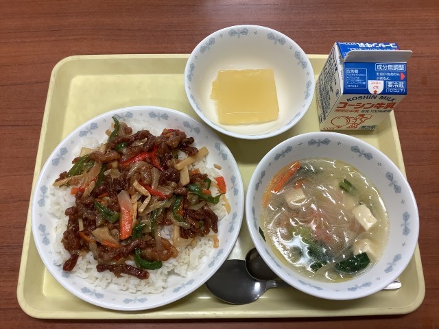 牛乳 チンジャオロース丼 春雨スープ つぶつぶりんご寒天