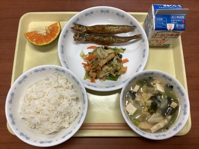 牛乳 麦ごはん ししゃものカレー揚げ 切干し大根と小松菜の和え物 具だくさん味噌汁 はやか