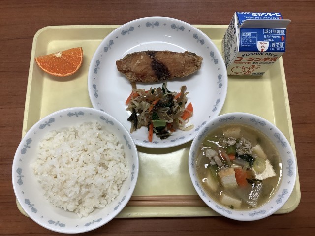 牛乳 麦ごはん かつおの和風レモンソースかけ 小松菜の磯和え 豚汁 みはや