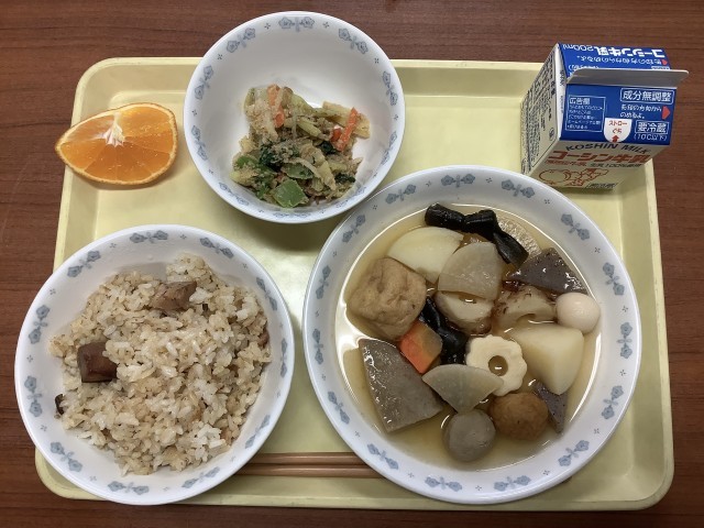 牛乳 かつお飯 おでん 小松菜のごま和え 夢おれんじ