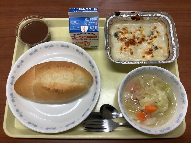 牛乳 ソフトフランスパン 米粉のポテトグラタン キャベツとベーコンのスープ チョコレートムース