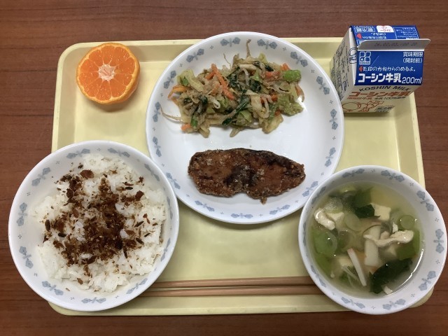 牛乳 麦ごはん だし節でんぶ かつおの竜田揚げ ごま和え すまし汁 ぽんかん