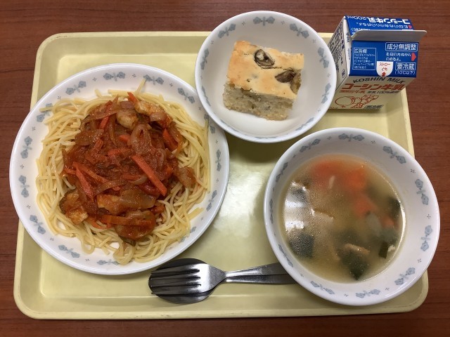 牛乳 スパゲティーペスカトーレ ポテトスープ 米粉のバナナケーキ