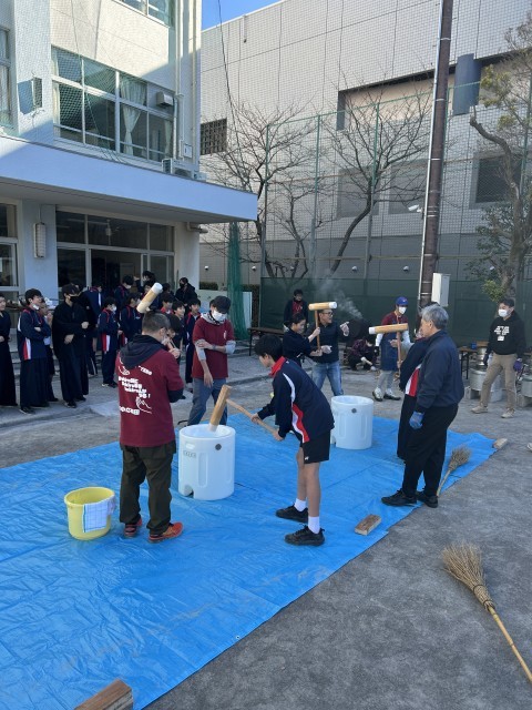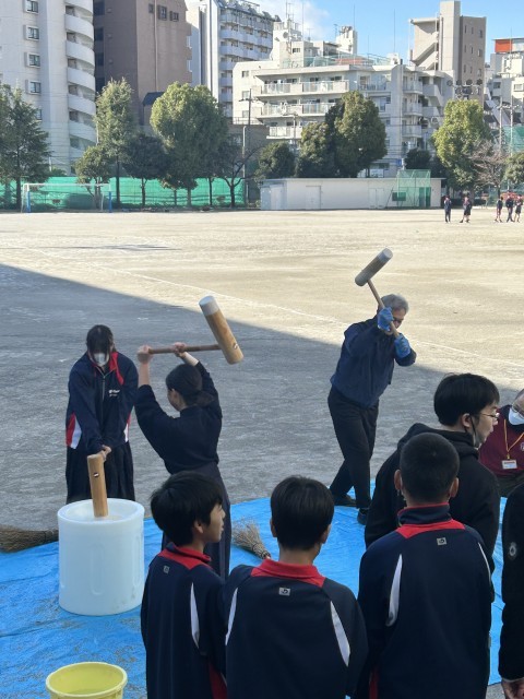 西葛西中学校では、毎年、PTAや保護者、OBなどが中心となり、餅つき大会を行っています。