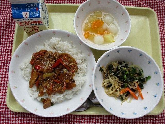 ★回鍋肉丼★もやしとわかめのごま醤油★フルーツ白玉★牛乳