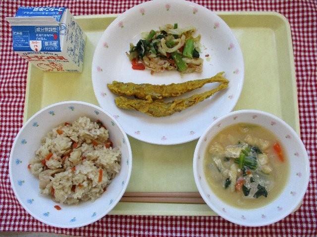 ★鶏おこわ★ししゃものカレー天ぷら★キャベツと小松菜の和え物★呉汁★牛乳