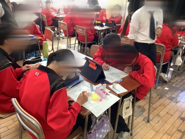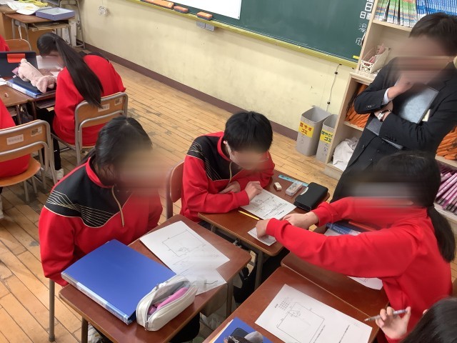 生徒たちは、模型を動かし、ヒント動画を見ながら問題に取り組みました。途中でグループ学習になり、班で考えをまとめるなど、答えを出すだけではなく、どのように考えてどのように解いたのかを相手に説明しなければなりません。