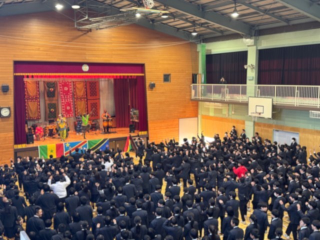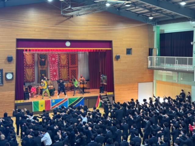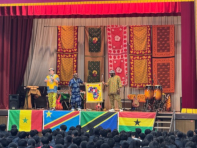 5校時はアフリカの音楽を奏でるアーティストを招いて様々な演奏を聴かせていただきました。本場の迫力のある演奏を聴聴いたり、一緒に歌ったり、ダンスしたりと生徒たちは皆楽しんでいる様子でした。音楽以外にもアフリカに関する話を聞くことができ、海外の文化について知るいい機会となりました。