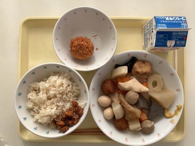 今日の給食では、大根、にんじん、こんにゃく、ちくわ、ちくわぶ、はんぺん、揚げボール、うずら卵、結び昆布、がんもなど12種類もの具が入っています。 濃いめにとったかつおと昆布の合わせだしが味の決め手です。