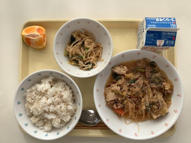 給食では牛肉ではなく、豚肉を使い、白菜、にんじん、長ネギ、春菊、えのき、焼き豆腐などを入れて作りました。