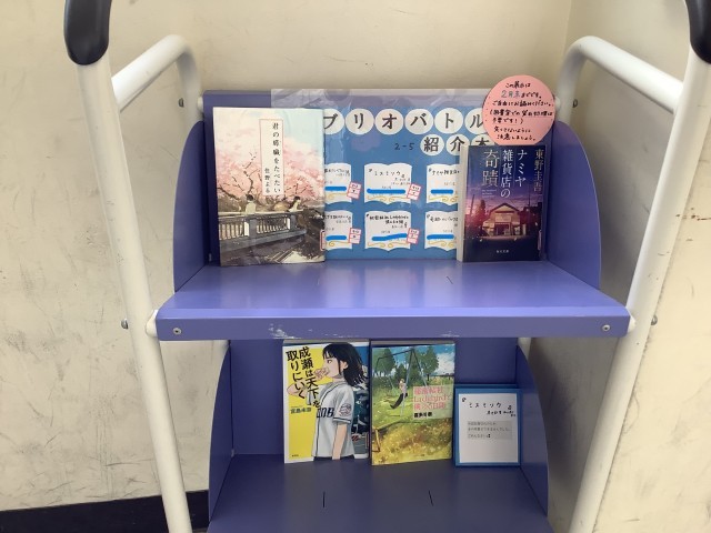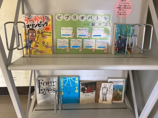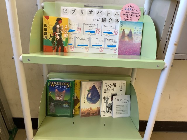 2年生の各クラスから6冊ずつ選ばれたビブリオバトルのチャンプ本を、学年フロアで紹介しています。